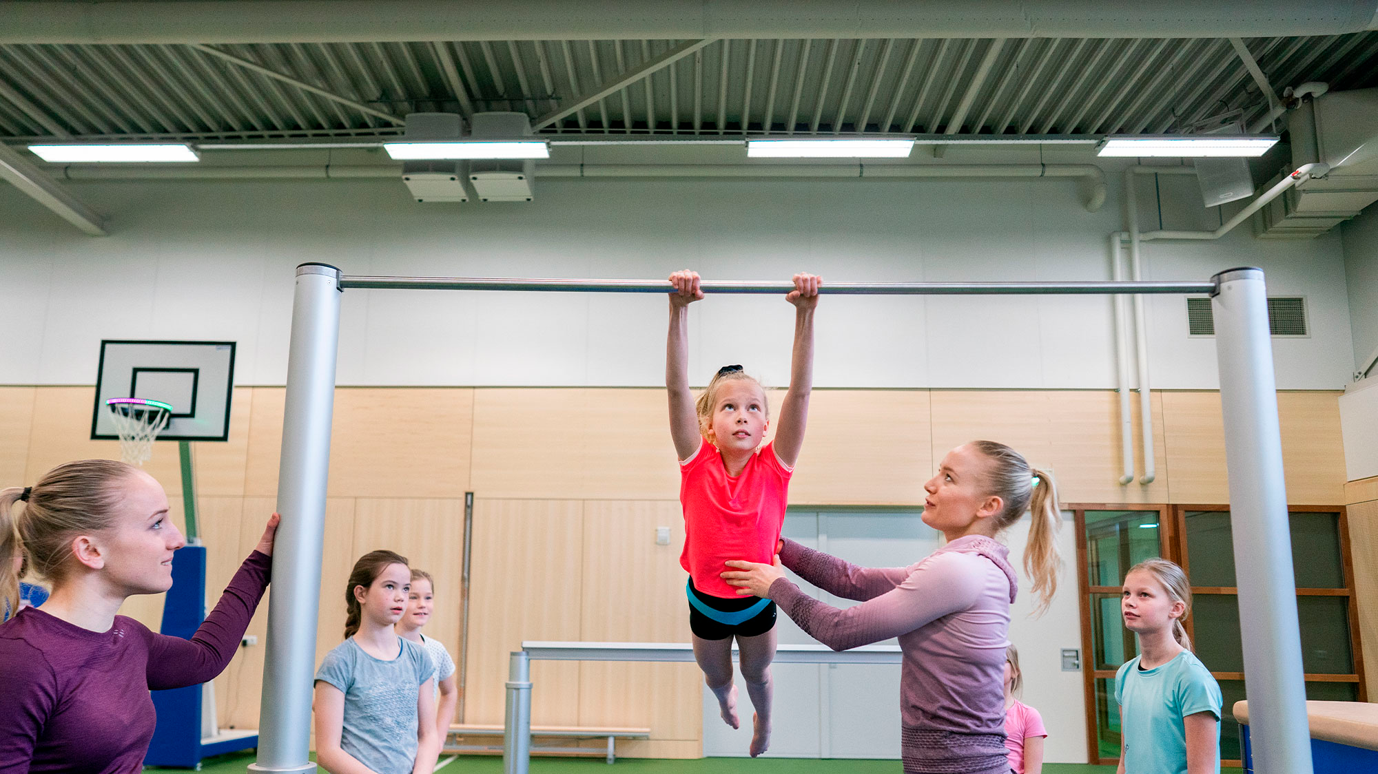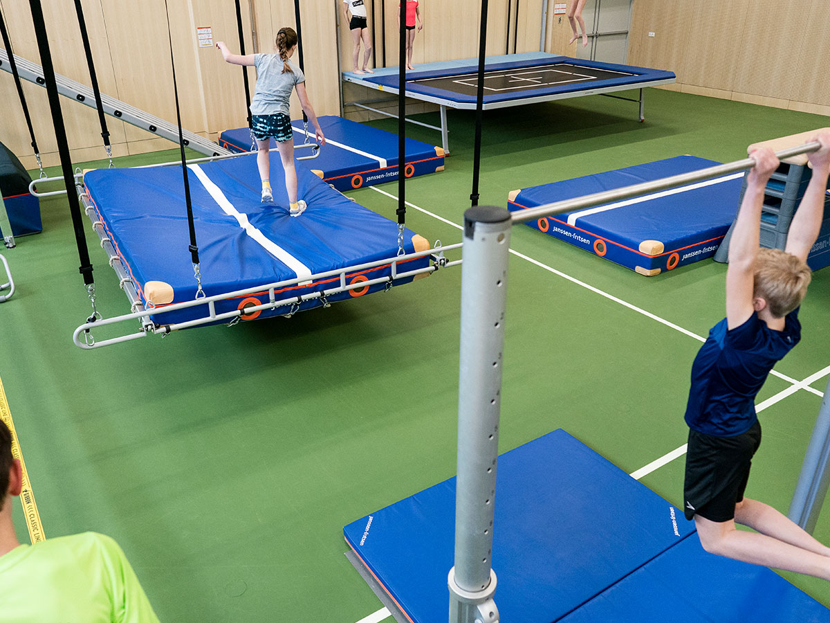 Met telescopische zuilen kun je heel wat toestellen combineren en zo telkens nieuwe variaties creëren. Je kunt er bijvoorbeeld rekstokken tussen hangen, ideaal voor zwaai- en optrekoefeningen. Ook evenwichtsbalken en turnbanken zijn eenvoudig in te haken, zodat je snel een parcours of oefening op maat maakt.